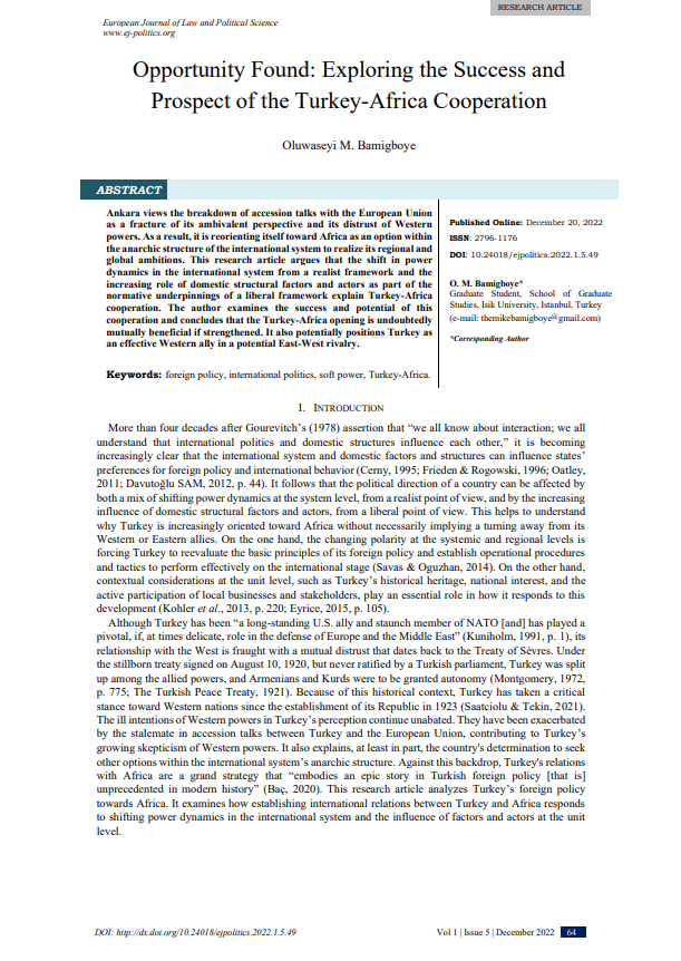 Ankara views the breakdown of accession talks with the European Union as a fracture of its ambivalent perspective and its distrust of Western powers. As a result, it is reorienting itself toward Africa as an option within the anarchic structure of the international system to realize its regional and global ambitions. This research article argues that the shift in power dynamics in the international system from a realist framework and the increasing role of domestic structural factors and actors as part of the normative underpinnings of a liberal framework explain Turkey-Africa cooperation. The author examines the success and potential of this cooperation and concludes that the Turkey-Africa opening is undoubtedly mutually beneficial if strengthened. It also potentially positions Turkey as an effective Western ally in a potential East-West rivalry.