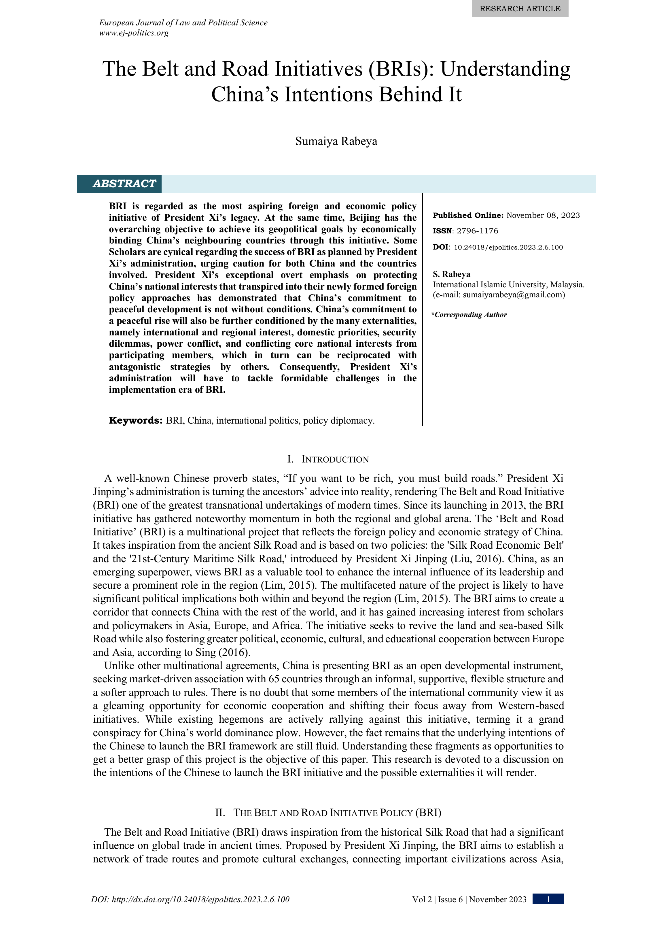 The Belt and Road Initiatives (BRIs): Understanding China’s Intentions Behind It