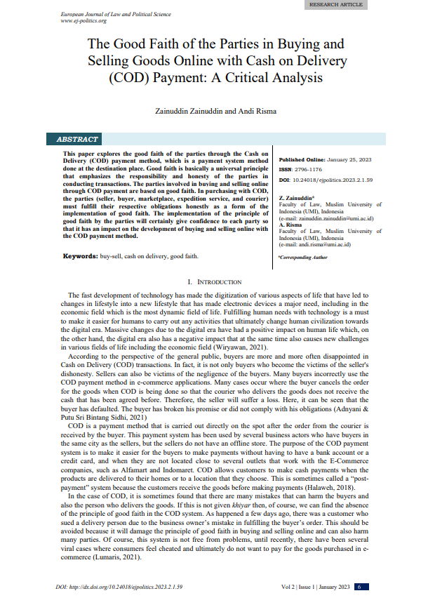 The Good Faith of the Parties in Buying and Selling Goods Online with Cash on Delivery (COD) Payment: A Critical Analysis
