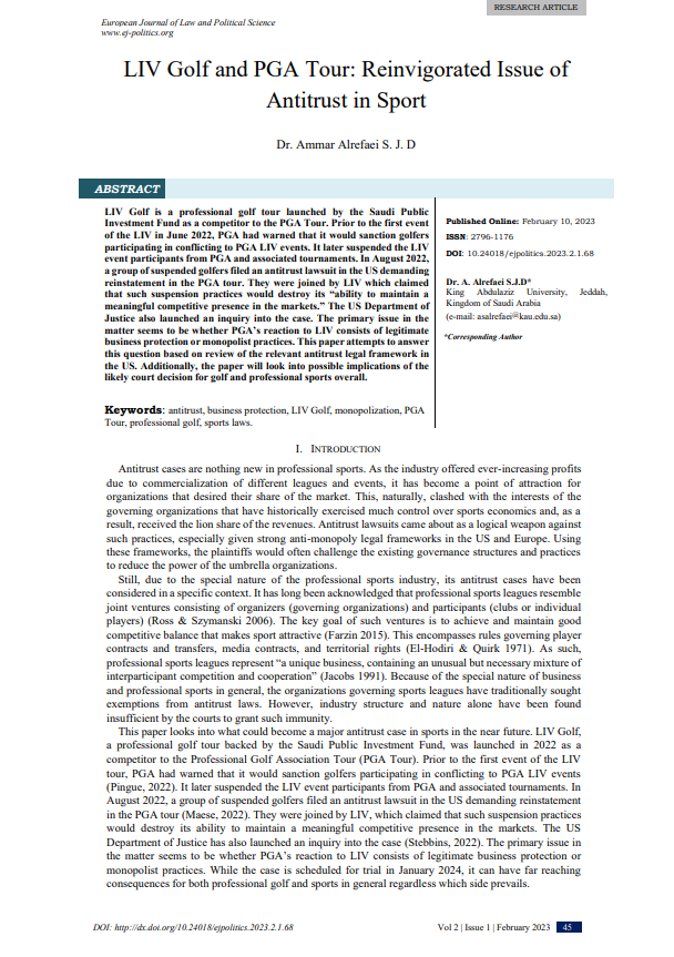 LIV Golf and PGA Tour: Reinvigorated Issue of Antitrust in Sport
