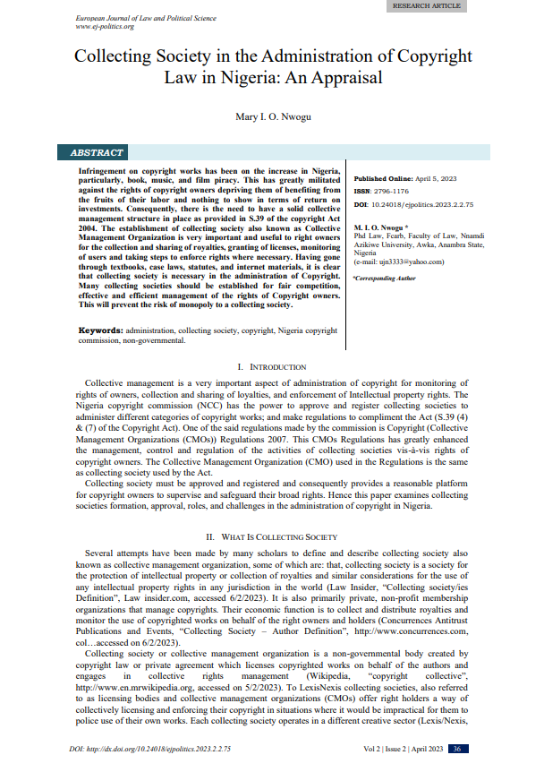 Collecting Society in the Administration of Copyright Law in Nigeria: An Appraisal