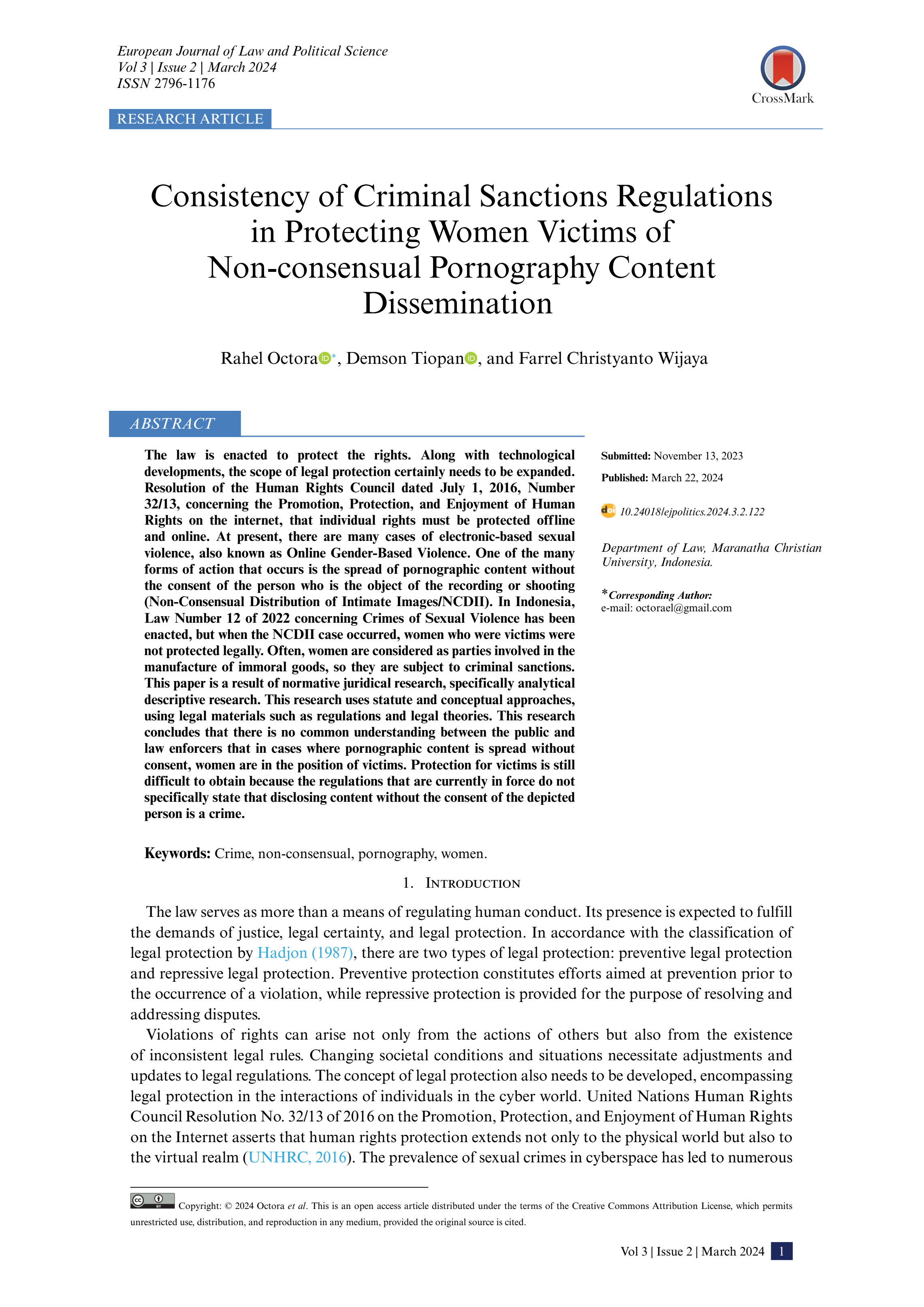 Consistency of Criminal Sanctions Regulations in Protecting Women Victims of Non-consensual Pornography Content Dissemination