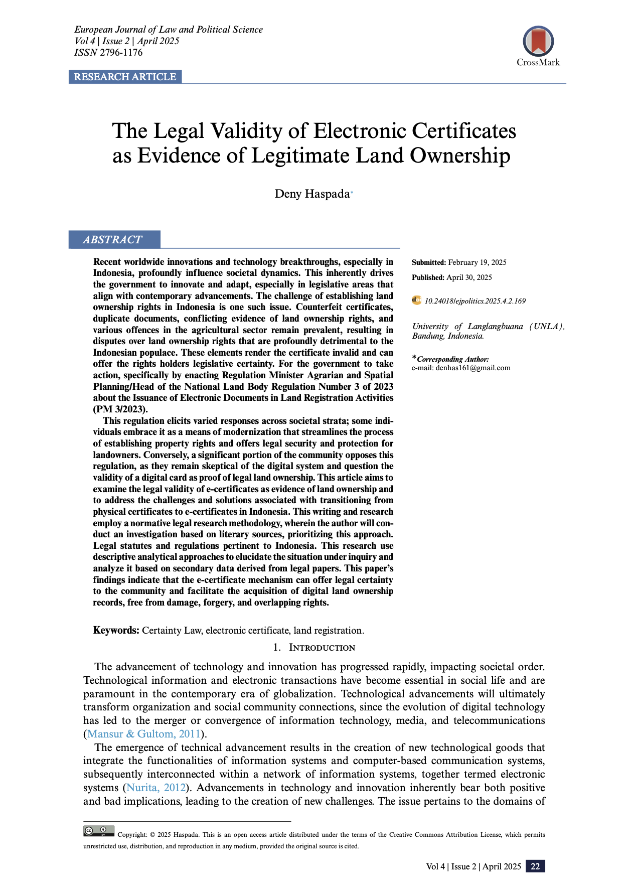 The Legal Validity of Electronic Certificates as Evidence of Legitimate Land Ownership